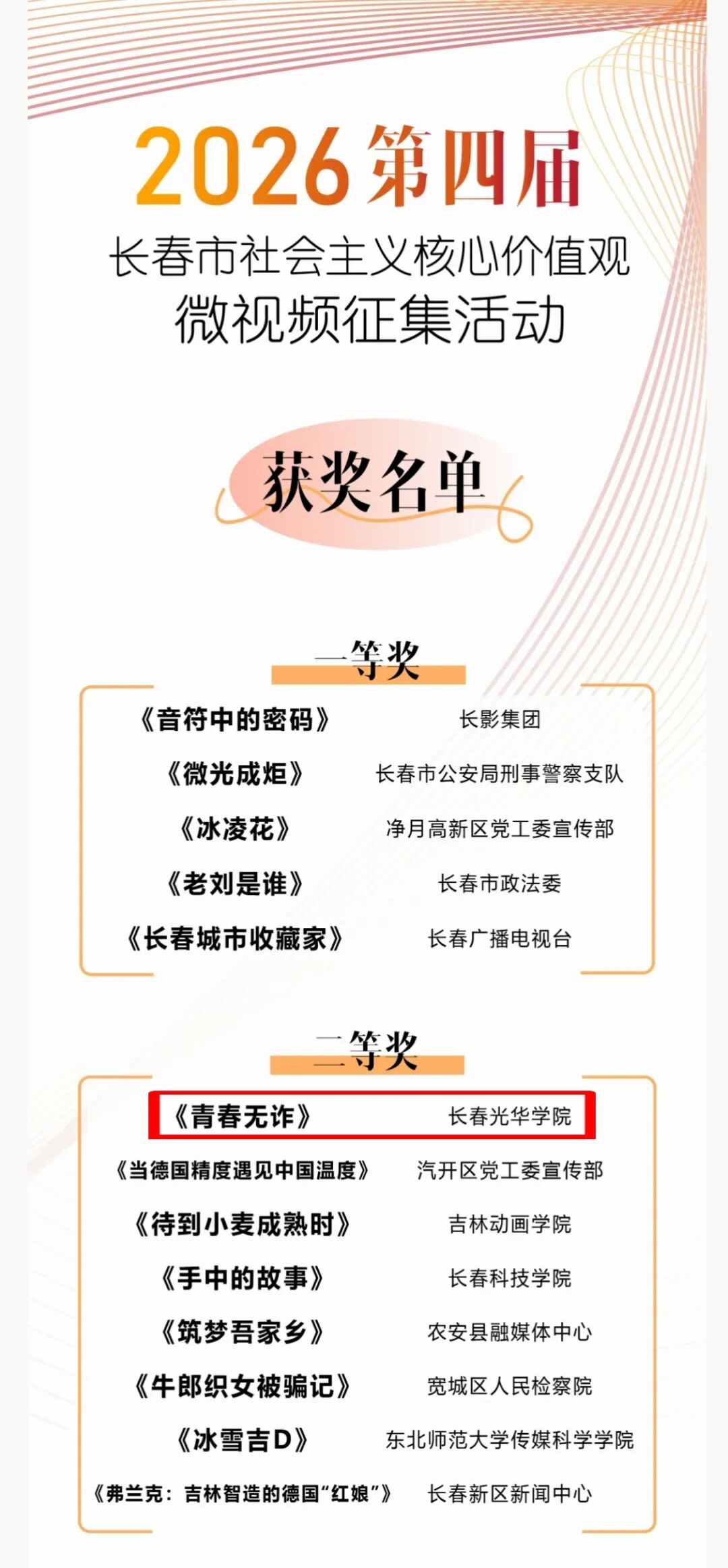 近日,第四届长春市社会主义核心价值观微视频大赛终评会圆满举行,由我校党委宣传部选送,电影学院魏畅创作的作品《青春无诈》,从1616部作品中脱颖而出荣获二等奖。